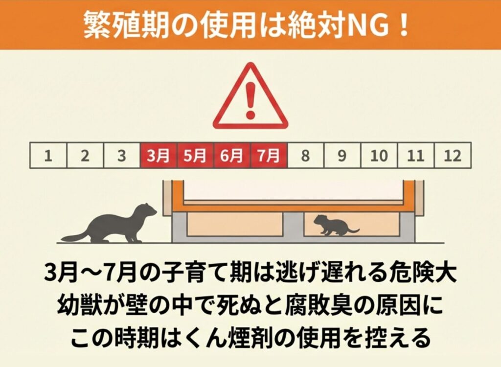この時期に使用すると、親イタチが幼獣を壁の隙間などに避難させ、後から救出できなくなって死んでしまう恐れがあります。