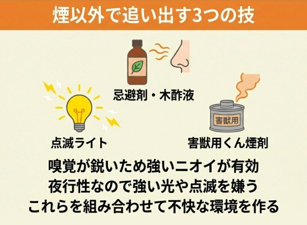 煙やニオイを嫌がって逃げ出すことはあるものの、根本的な駆除にはつながらず、数日で戻ってくるケースが多いのが実情です。