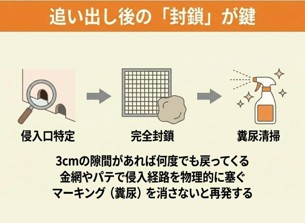 - 追い出し後の侵入経路封鎖を忘れない