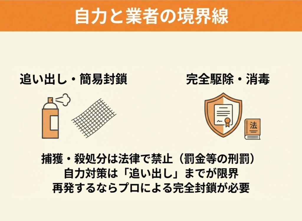 一般の方が自力で対処できる範囲は、追い出し作業と目に見える侵入口の封鎖までと考えておくのが現実的です。