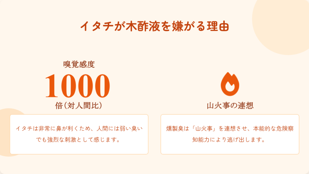 木酢液の燻製臭は山火事の煙と似た成分を持っているため、イタチの本能的な恐怖を呼び覚まします。
