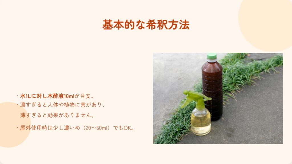木酢液を安全かつ効果的に使うには、適切な薄め方を守ることが欠かせません。