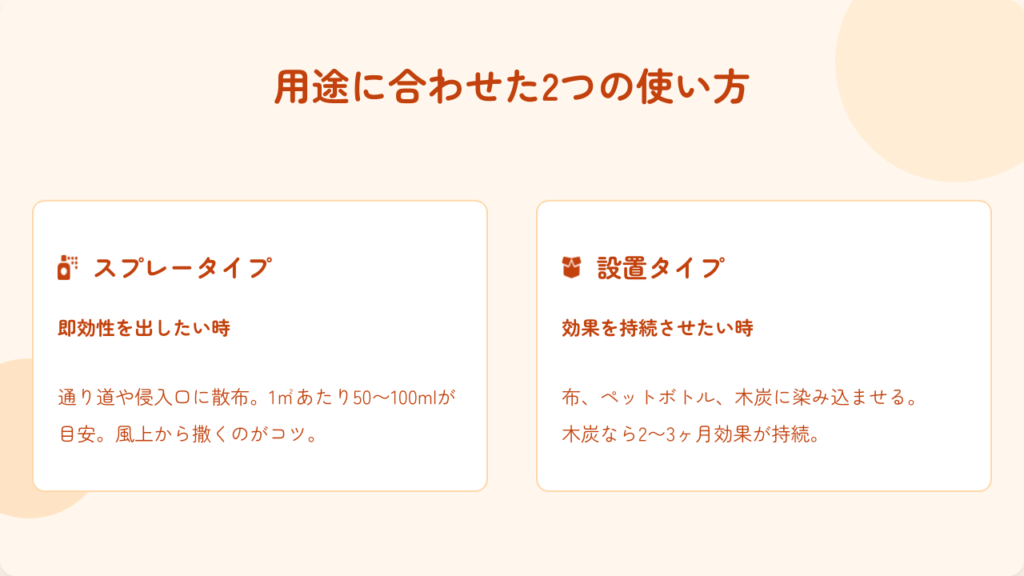 使い方によって効果の持続期間や範囲が変わるので、目的に合った方法を選んでください。