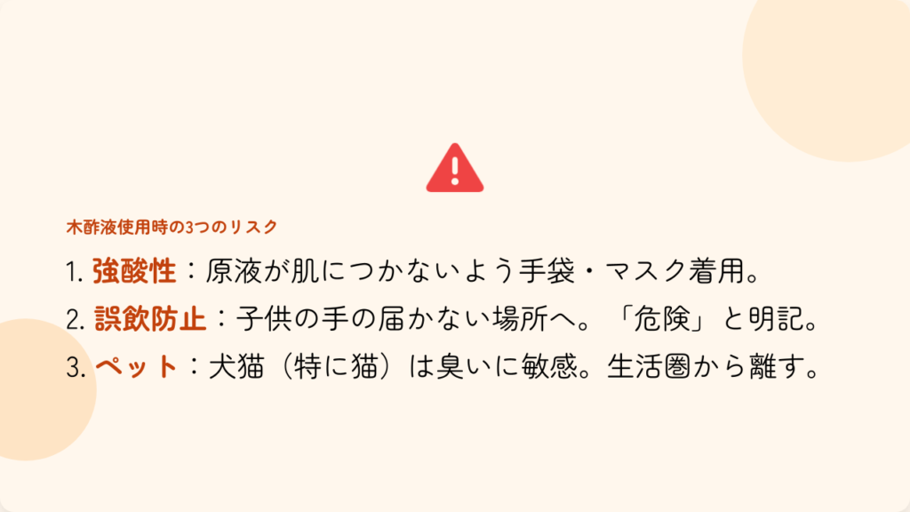 適切に薄めた木酢液は室内でも比較的安全ですが、換気と使用量に注意が必要です。